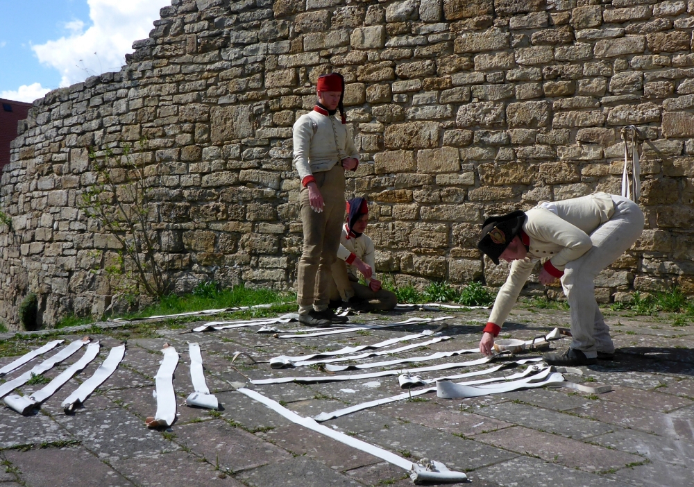 Unsere erste Zusammenkunft dieses Jahr widmeten wir dem Auffrischen unserer Exerzier-Künste sowie der Instandsetzung unserer Ausrüstung: Wir weißten unser Lederzeug, steiften unsere Hüte und flickten an der Bekleidung, was zu flicken war. Unsere Führung bestand aus unserem Sergenten Rôtisseur sowie den Grenadieren Champagne und Pas Perdu, außerdem waren die Grenadiere Sans-Souci, Le Fleuri, Trompelamort, Belle Humeur, L'Agitateur sowie als Gast Grenadier Le Russe mit von der Partie. Champagne und L'Agitateur stießen jedoch erst am Samstagmorgen zu uns. Zusätzlich wurden wir noch durch einen Caporal und drei Kanoniere unserer ehemaligen Bataillons-Artillerie verstärkt, die inzwischen dem 1er régiment d'artillerie angehören.